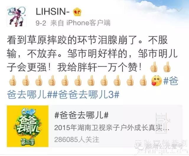 随着《爸爸去哪儿》播出以来,五个古灵精怪的萌娃不断用自己暖心懂事坚强的黄金品质刷新广大观众对于自己的认知,网友纷纷慨叹从孩子们身上学到很多。尤其是最小的萌娃邹明轩,刚出场时,他只是一个有着一头卷发、一张胖嘟嘟的脸、一口地道的贵州口音普通话、上交零食玩具会哭得惊天动地的四岁小男生,然而随着节目的进行,这个四岁的小男生在展示着属于他年龄段的纯真无邪的同时,也让各位观众们看到了他超出年龄的勇气与担当。