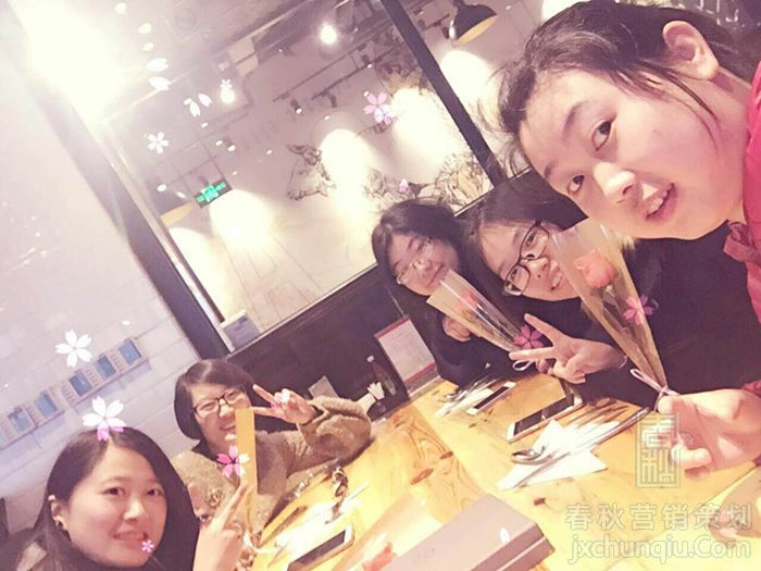 女神们手持一朵粉红色的玫瑰,脸上洋溢着笑容,除了大餐后的满足,还有在春秋奋斗带给她们满满的幸福感。