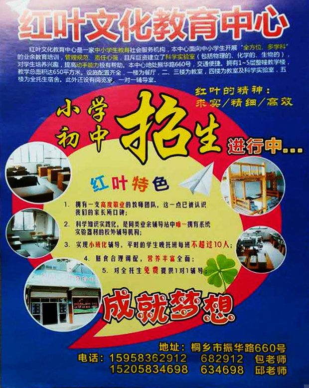 桐乡红叶文化教育中心拥有一支高度敬业的教师团队,实现小班化辅导,接收全托学生。在保障教学质量之后,为孩子提供有趣的课外活动。