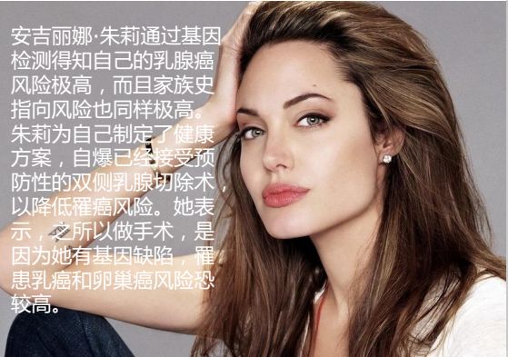2013年5月,安吉丽娜·朱莉(Angelina?Jolie)向外界透露她的隐私,引起了全球轰动,通过这样的名人效应把易感基因与肿瘤预防的关系做了非常好的科普宣传。当时年龄37岁,已是6个孩子母亲的朱莉对外界说:她的母亲与癌症搏斗了近十年,于2007年死于卵巢癌,享年56岁。通过易感基因检测,朱莉同样带有一个“缺陷”基因BRCA1,她患乳腺癌和卵巢癌的风险非常之高。为了预防可能的风险,她决定接受手术,切除双侧乳腺。手术后,她患乳腺癌的几率已经从87%下降到5%。